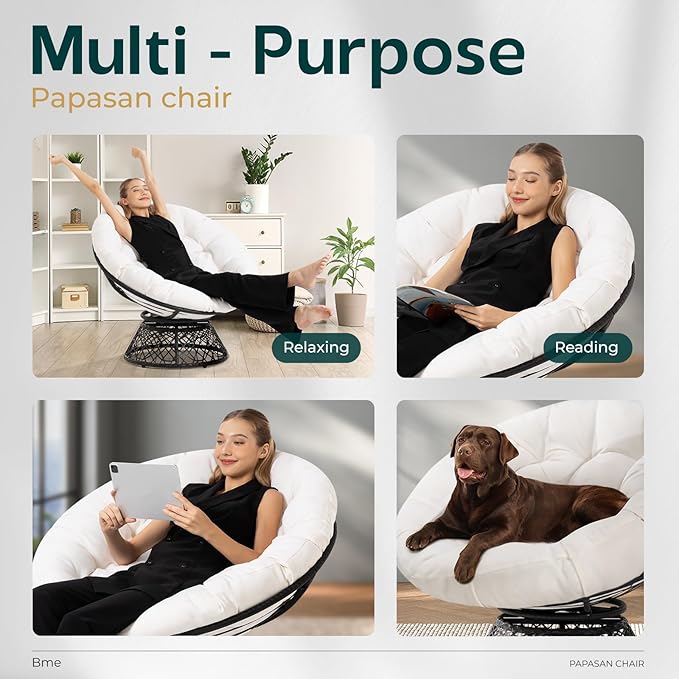 Bme 40" Ergonomic Wicker Papasan Chair with Soft Thick Cushion & Frame, 360° Swivel, Circle, Reading, Comfy Chair for Living Room, Bedroom