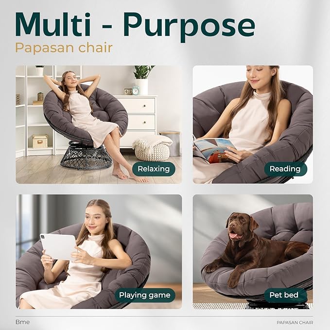 Bme 40" Ergonomic Wicker Papasan Chair with Soft Thick Cushion & Frame, 360° Swivel, Circle, Reading, Comfy Chair for Living Room, Bedroom