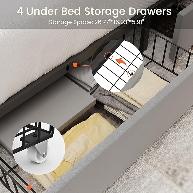 - 【Built to Last】 Crafted with high-quality materials and double-welded joints, this upholstered platform bed frame with storage drawers can withstand daily wear; The bed frame with reinforced wood slats create a strong support that resists sagging even under 900 lbs weight