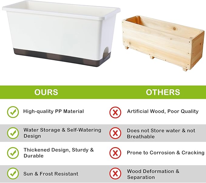 - 【Premium & Durable】The planter pots are made of high quality PP material and has been thickened to bear up to 300KG (660LB). This window box planter is sturdy, wear-resistant and durable. It can be exposed to light, wind, and sunlight for long periods of time, with a lifespan of decades. It is an excellent planter box for both indoor and outdoor.
