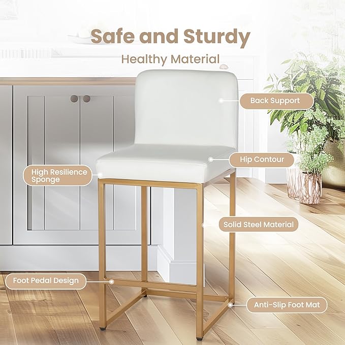 PHI VILLA Bar Stools Set of 4 - Bar Stools with Back Leather Stools for Kitchen Counter, White and Gold Counter Height Bar Stool