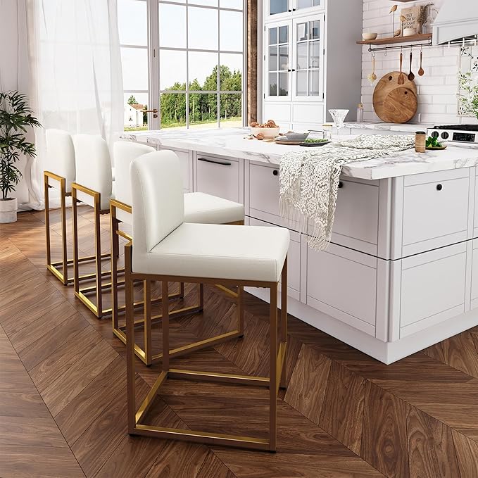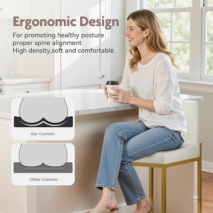 - [Upholstered PU Leather Seat]: The kitchen counter stools feature a retro matte leather surface that efficiently prevents water and stains, making cleaning easy. The 3.54" thick upholstered seat design with a soft backrest ensures a cozy seating experience. Upgrade your dining area now use our stylish counter height bar stools!