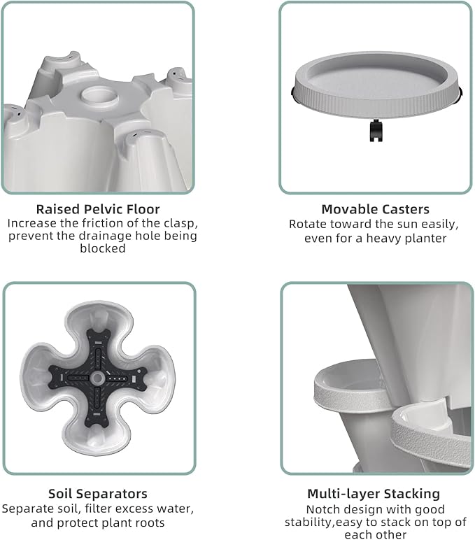 - Flow Design - The water filtration system from top to bottom can save water and retain moisture but prevents overwatering. 7 filters are placed on each level to keep the soil from going through the big drainage holes, it also helps retain water in each planter level.