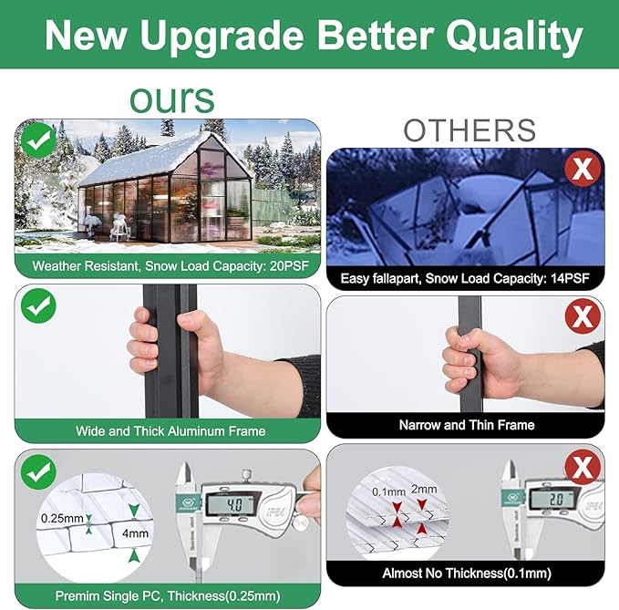 - Sturdy Frame: Our greenhouse kit boasts a robust rust-resistant aluminum frame designed to withstand various weather conditions. 2 skilled enthusiasts can assemble this greenhouse kit within just 4-6 hours. Introducing patented technology, Easy assembly, saving you 50% of your time. Gone are the days of tedious setups. With a simple push and locking screw, our Quick Connect ensures a reliable, secure, and swift link-up. It can also support snow loads of up to 20PSF.