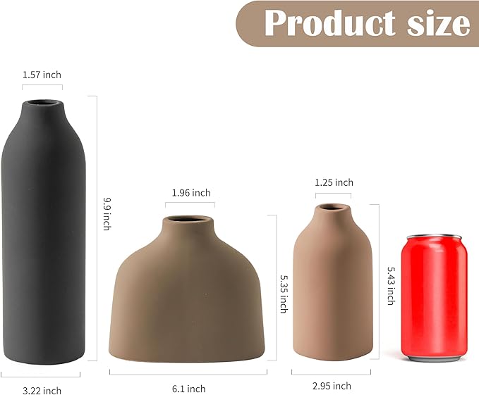 - Living Room Decor and Accessories – (Dimensions: 9.9” x 3.22”; 6.1”L x 1.96”W; 5.35”L x 2.95”) These vases are the ideal home house decor, effortlessly complementing any room or style. Whether your aesthetic is boho, modern farmhouse, rustic, or cottagecore, this versatile set brings a timeless, elegant touch to your space.