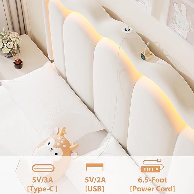 - CHARGING STATION & SIDE POCKETS:This princess bed offers not only comfortable upholstery and an elegant look but also added more convenience. USB and Type-C ports at the headboard keep your devices charged without needing to leave your comfortable bed. Two side pockets provide easy storage for glasses, combs, phones, remotes, and other small essentials, keeping everything within reach