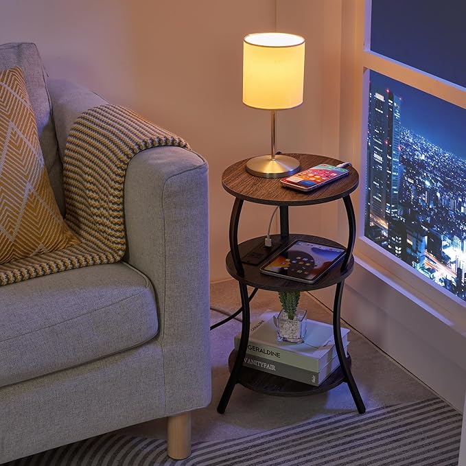 - 【Small Round Side Table with Charging Station】 This 3-tier round table nightstand has 2 built-in standard AC outlets (120Vmax/12A max), 2 USB ports (5V/2A max) and a 4.9ft power cord, enough for charging needs, it can easily charge your phone, laptop and tablet, or plug in a light. Great table for storage and charging.