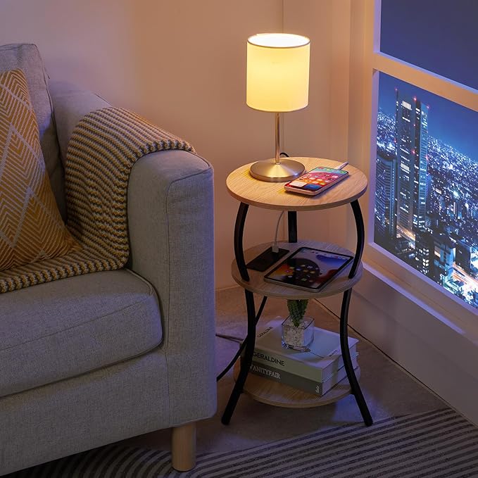 - 【Small Round Side Table with Charging Station】 This 3-tier round table nightstand has 2 built-in standard AC outlets (120Vmax/12A max), 2 USB ports (5V/2A max) and a 4.9ft power cord, enough for charging needs, it can easily charge your phone, laptop and tablet, or plug in a light. Great table for storage and charging.