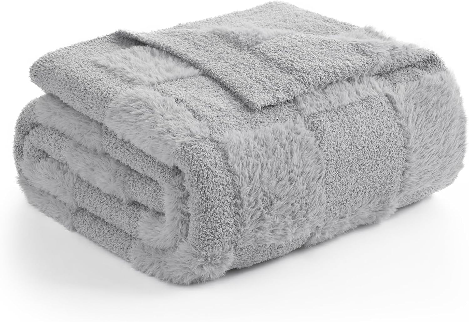Snuggle Sac Faux Fur Checkered Blanket Twin Size with Soft Knitted Microfiber Fabric,Cozy Soft Warm Blanket for Sofa Bedroom Living Room,Solid Light Grey,60x80 inches