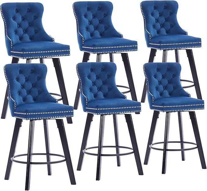 YISHENG Modern Swivel 27" H Seat Set of 6 Velvet Barstools with Backrest and Footrest,Button Tufted Rivet Trim Dining Room Chairs with Metal Pull Ring for Kitchen Island,Bistro, Home Bar,Blue