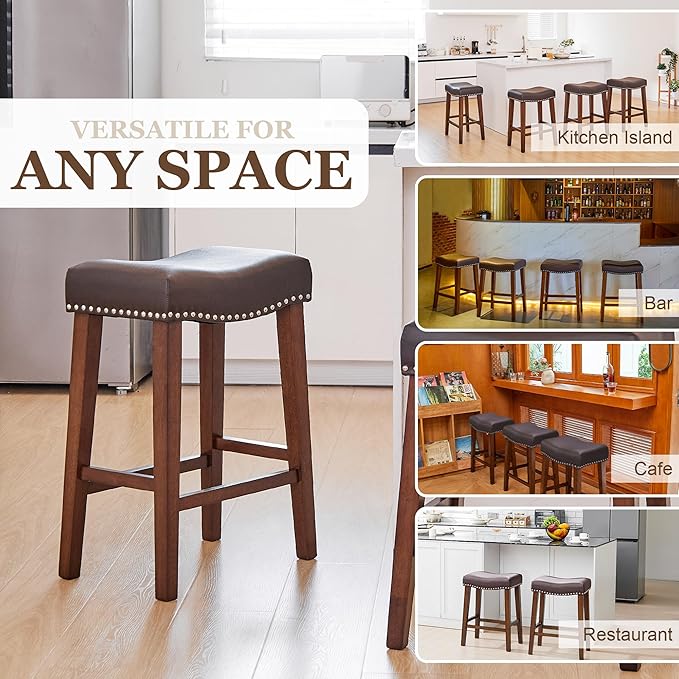 - Premium Material: Our saddle bar stool is made of waterproof faux leather, which is easy to clean. The seats are filled with high-density sponge, which feels very fine and soft and looks brand new even after long-term use. The nail head decorative ring around the farmhouse bar stools adds a unique sense of sophistication to your space, and the classic shape will take your indoor seating aesthetics to the next level.