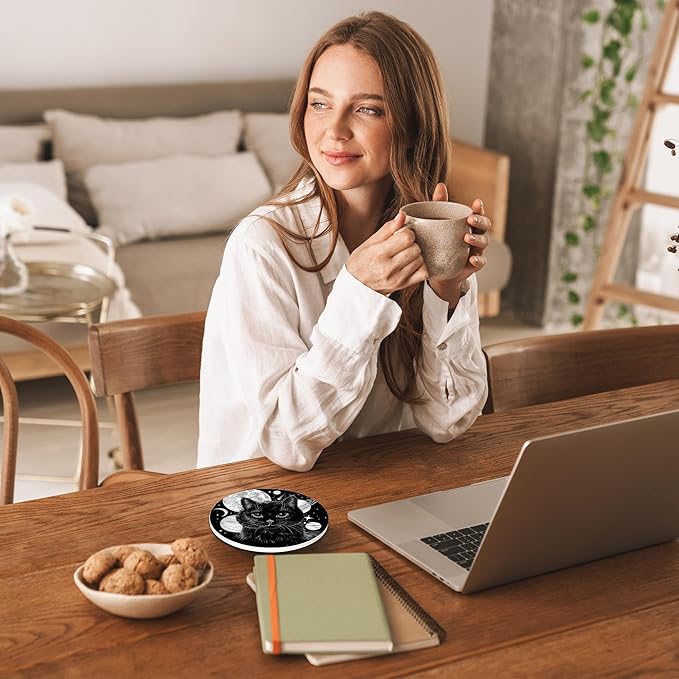 Black Cat Drinks Coasters Set of 4,Ceramic Absorbent Stone Cup Mat with Cork Base,Table Home Decor, Ideal Gifts for Women Men