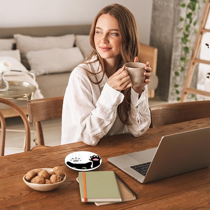 Drinks Coasters Set of 4, Black Cat Round 4" Cup Coasters, Absorbent Ceramic Stone Coasters with Cork Base, Cute Coasters for Table Home Décor, Ideal Gifts for Women Men