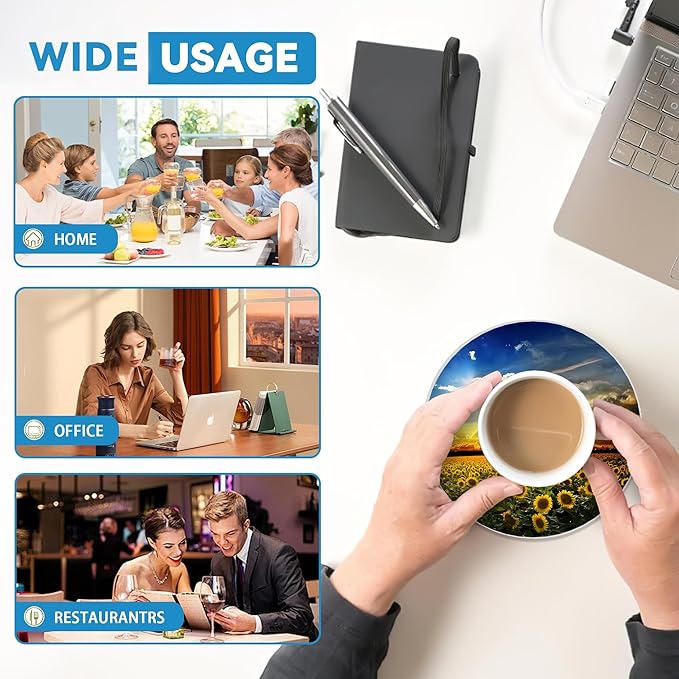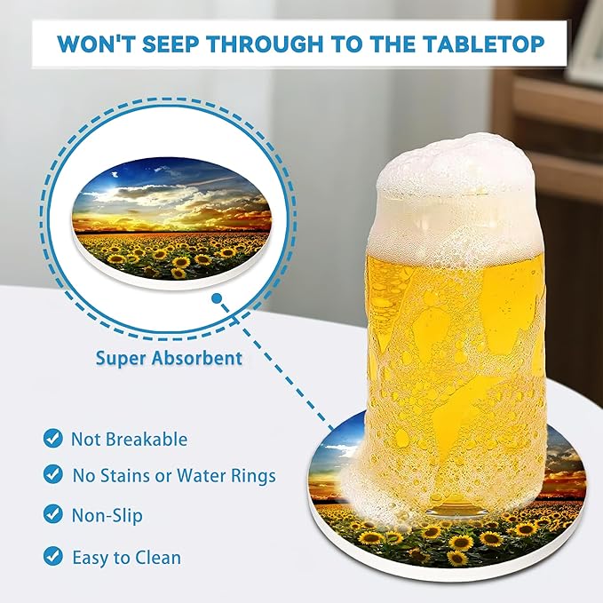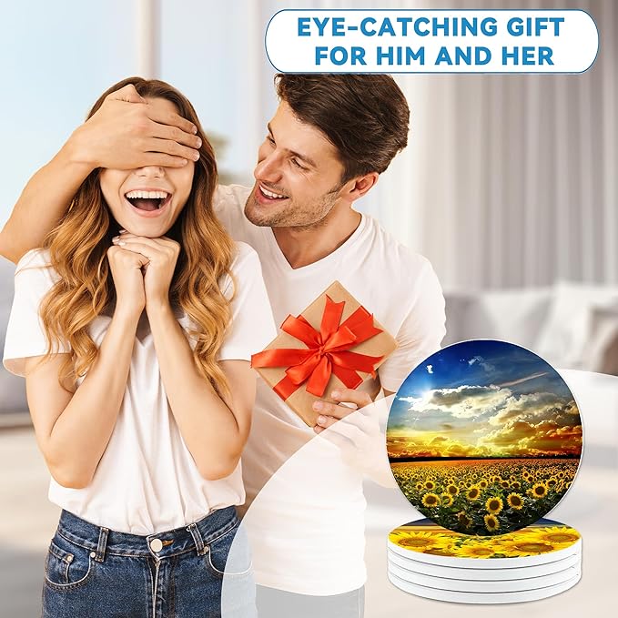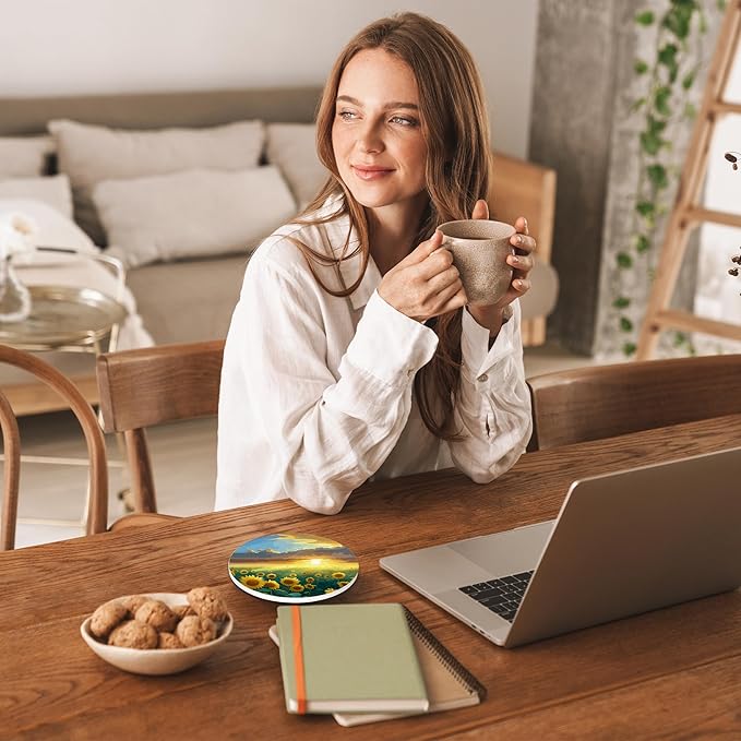 Drinks Coasters Set of 4, Sunflower Round 4" Cup Coasters, Absorbent Ceramic Stone Coasters with Cork Base, Cute Coasters for Table Home Décor, Ideal Gifts for Women Men