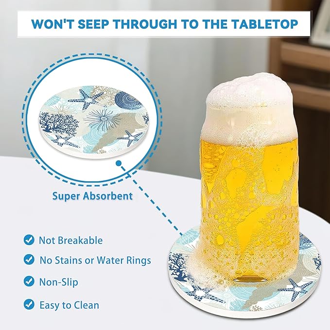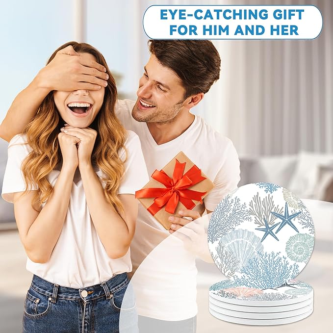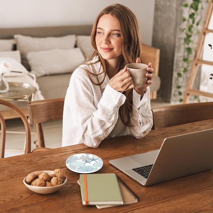Seashell Coasters Set of 4, Starfish Beach Theme Round 4" Cup Coasters with Cork Base, Absorbent Ceramic Stone Coaster for Table Home Décor, Ideal Gifts for Women Men