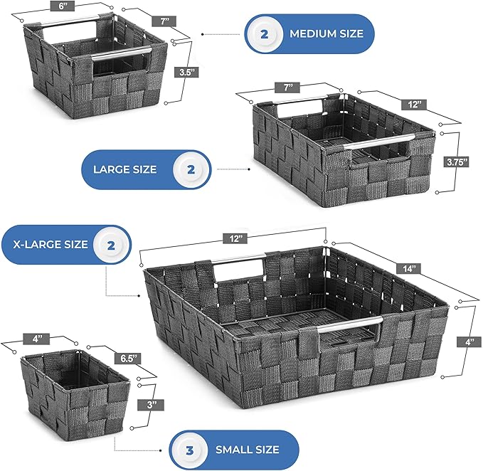- Versatile 9-Piece Set for Complete Organization This set includes 2 Large (14" x 12" x 4"), 2 Large Slim (12" x 7" x 3.75"), 2 Medium (7" x 6" x 3.5"), and 3 Small (6.5" x 4" x 3") baskets, perfect for organizing a variety of items