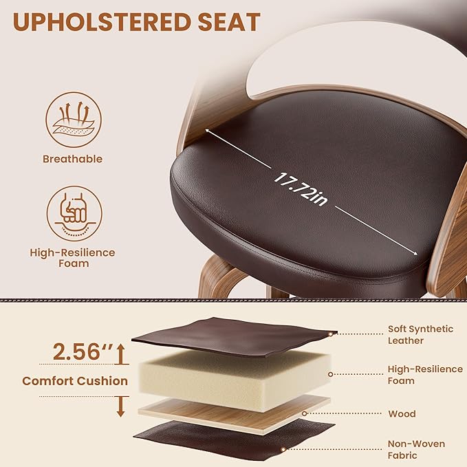 Bar Stools Set of 1, 26" Counter Height Barstools with Bentwood Legs, Swivel Counter Stools with Back, Mid Century Modern Faux Leather Upholstered Bar Chairs for Kitchen Island, Brown
