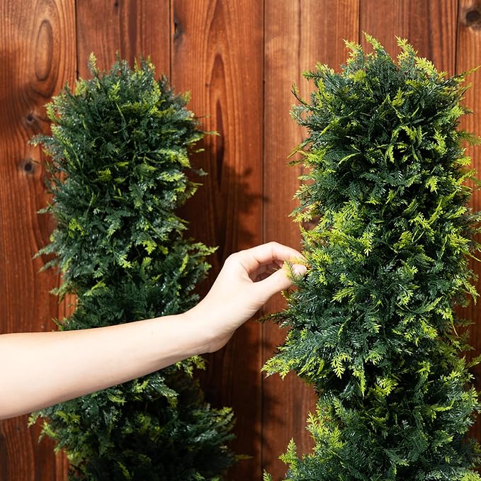 - REALISTIC APPEARANCE - These spiral topiary trees boast a lush, full-bodied look with dense, lifelike foliage that mimics natural boxwood or cedar.