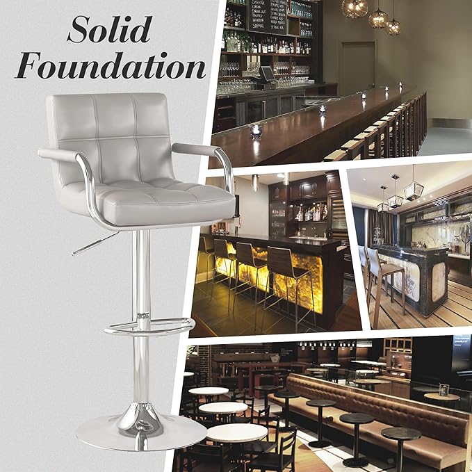 Modern PU Leather Bar Stools Set of 2, Adjustable Swivel Square Bar Chairs, Counter Height Barstools with Arms and Large Base for Island/Kitchen(Gray)