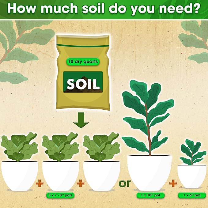 - 🌳Pre-Mixed & Ready to Use: Our fiddle leaf fig potting soil mix is meticulously crafted for convenience. It includes a 5-in-1 blend of coco coir, coconut fiber, perlite, pumice, and pine bark, ensuring optimal fiddle leaf fig care and growth. Saving more your time and money than preparing by yourself. Available in 6 and 10 quarts,10 quarts can fill up to 3 pots of 7–8'' or 1 pot of 10" plus 1 pot of 6".