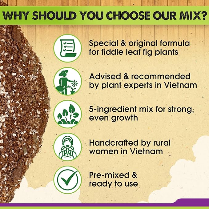 - 🌳5-in-1 Nutrient-Rich Blend: Enhance your fiddle leaf fig tree care with our specialized mix. The combination of coco coir, coconut fiber provides essential nutrients and minerals needed for healthy fiddle leaf fig growth.