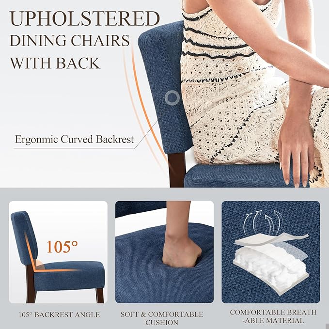 - ERGONOMIC DINING CHAIRS WITH BACK: Upholstered dining chairs are ergonomic. The padding and support provided by the soft back and cushion promote great posture and reduce the risk of back pain or discomfort. Whether you are looking for comfortable seating for dining room, living room, office space, bistro, or farmhouse, our comfy accent dining chairs are the great choice,with their combination of style, comfort, and versatility.