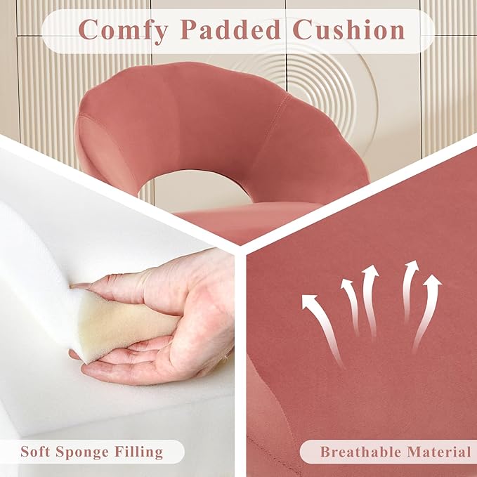 - 【Vanity Chair with Hollow Back】 This velvet chair has a curvy petal shape and a rustic light color that gives it a warm, modern aesthetic. The U-shaped arms give the chair a striking look, and the slightly sloped back makes it easy to sink into.