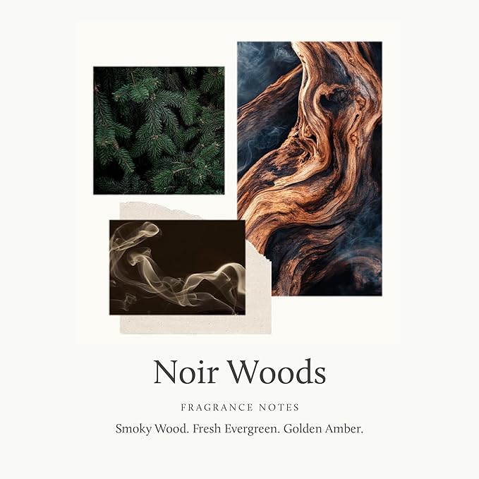 - Noir Woods Scented Diffuser - Smoky wood and fresh evergreen blend with golden amber to create a refined fragrance that invites moments of stillness, connection, and inspiration. A scent that sets the tone, this room fragrance diffuser turns ordinary time into something intentional.
