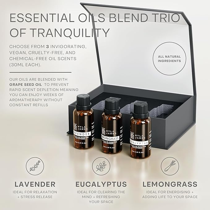 - BREATHE IN INSTANT RELAXATION and enjoy the 3 essential oil reed diffuser set. The lavender reed diffuser brings calm, the lemongrass gives a refreshing boost & the eucalyptus reed diffuser delivers an invigorating scent. Each one has a grape seed oil base for a clean aroma