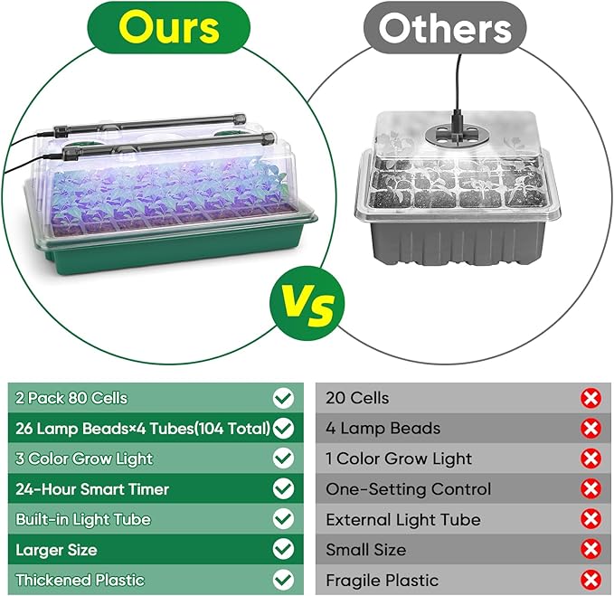- 【Adjustable Humidity/Light& Display Screen Timer】Upgraded seed starter tray design, our new version seed starter trays that you can add grow light strip to cultivate seed and adjustable vent hole cover to change the humidity of trays(note: when you install the round vent cover, please press harder) .Display screen of lighting time for better control growing situation of seeding,1-24 hours timed to choose,flexible working time will suitable for all kinds of seed to use.