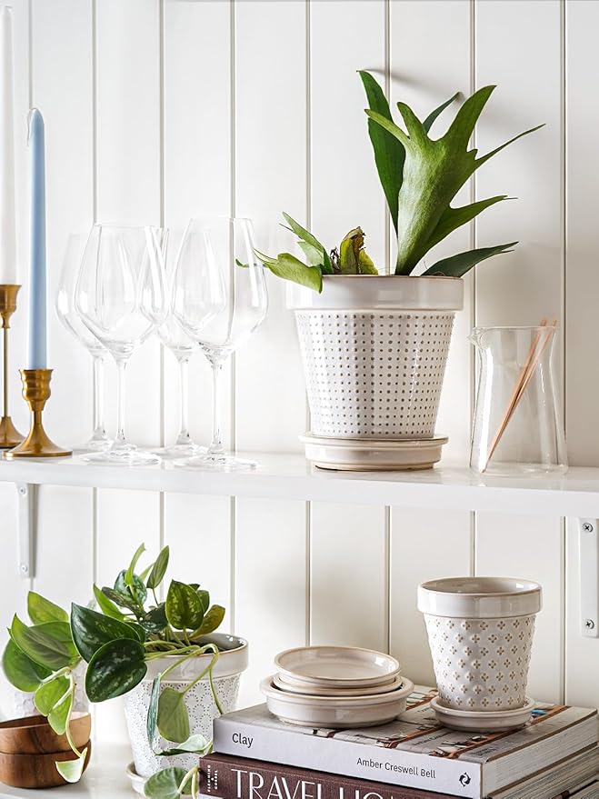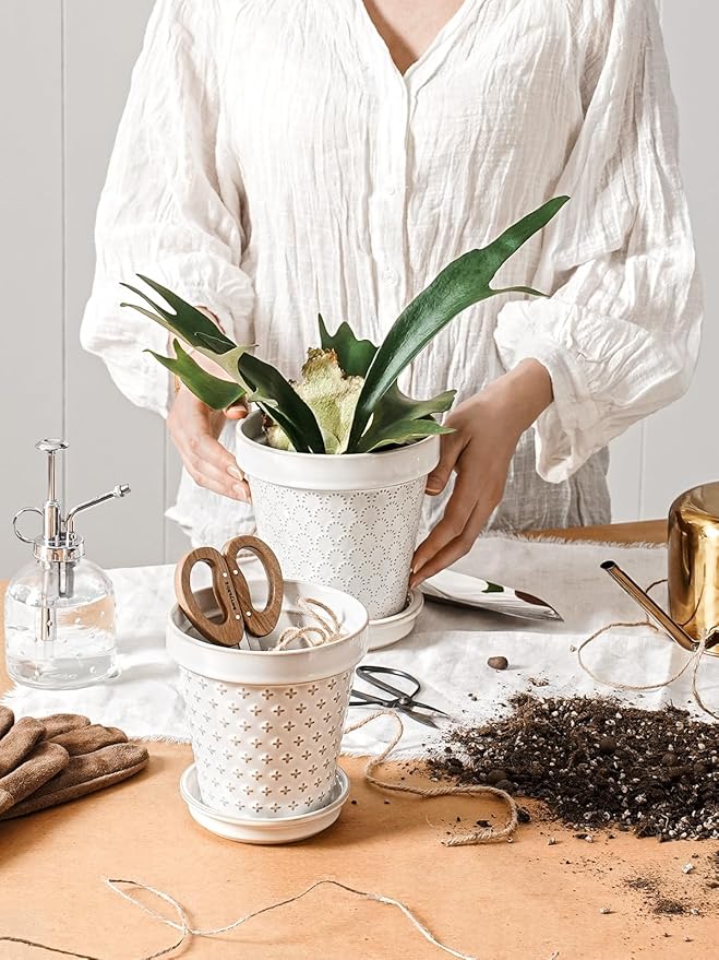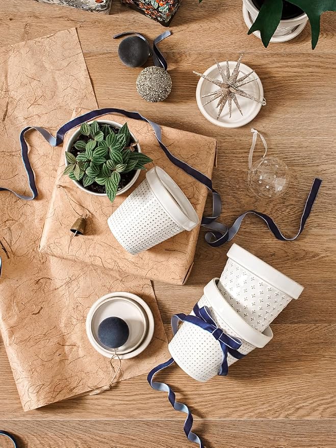- Elegant Embossed Design: Featuring a unique relief pattern on each pot, this set adds a touch of artistry to any room. The arctic white glaze paired with a light brown pattern creates a timeless, elegant look that beautifully complements the green of your plants, enhancing your living space, bookshelf, or office desk