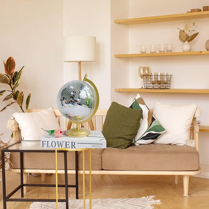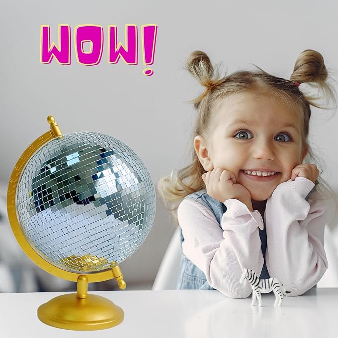 - Size: The diameter size is 8inch 20cm,the product size is 8.5L x 8W x 12H inches,this handmade disco ball gold globe is made of disco mirror ball with gold metal stand,the compact size makes it ideal for tabletops, desks, or shelves,perfect for those who appreciate modern art and want to add a contemporary twist to their interior design