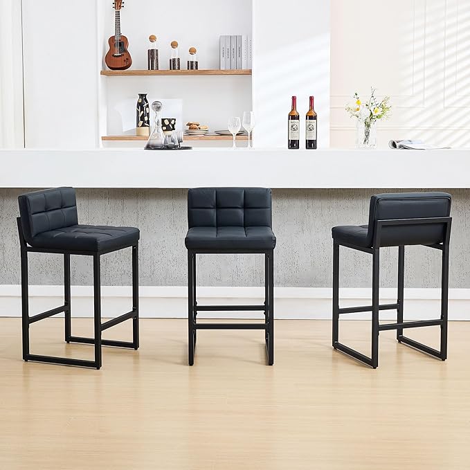 Bar Stools Set of 3, Upholstered Faux Leather Counter Height Barstools with Low Back and Thickened Metal Legs, Modern Bar Chairs for Kitchen Island, Bar, Counter (Black, 3Pcs 26" Bar Stools)