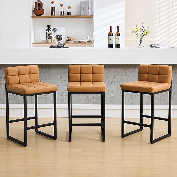 Bar Stools Set of 3, Upholstered PU Leather Counter Height Barstools with Low Back and Thickened Metal Legs, Modern Island Chairs for Kitchen Island (Caramel Brown, 3Pcs 26" Bar Stools)