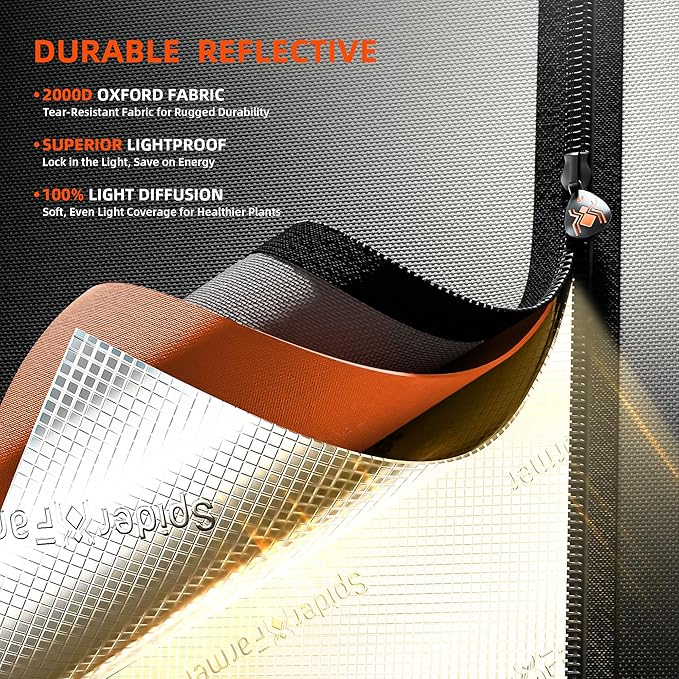 - Superior Performance: 2000D double-stitched canvas and 100% reflective diamond mylar, ensure exceptional durability and tear resistance. The high reflectivity enhances light efficiency, maximizing light exposure for optimal photosynthesis and healthy plant growth