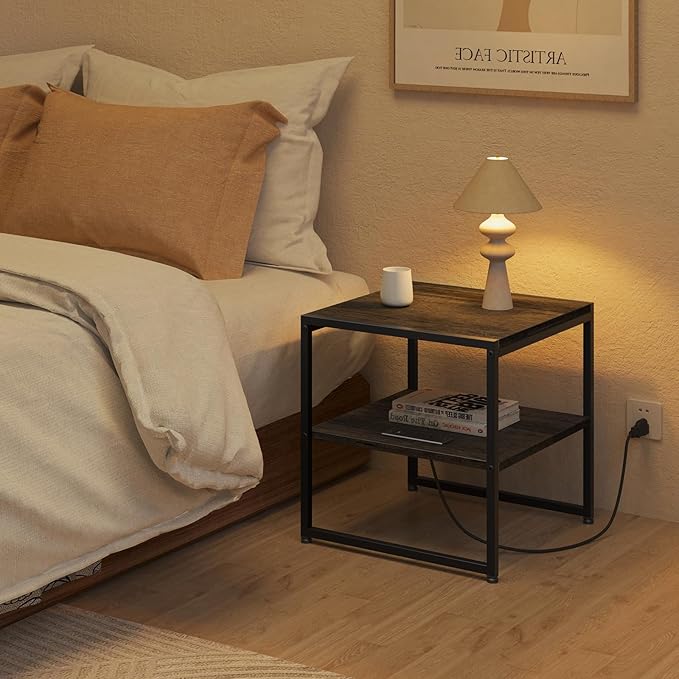Tatub 20" End Table with Charging Station, Industrial Square Side Table with USB Ports & Outlets, Versatile 2-Tier Small Nightstand for Bedroom Living Room, Grey