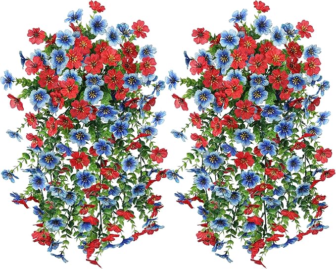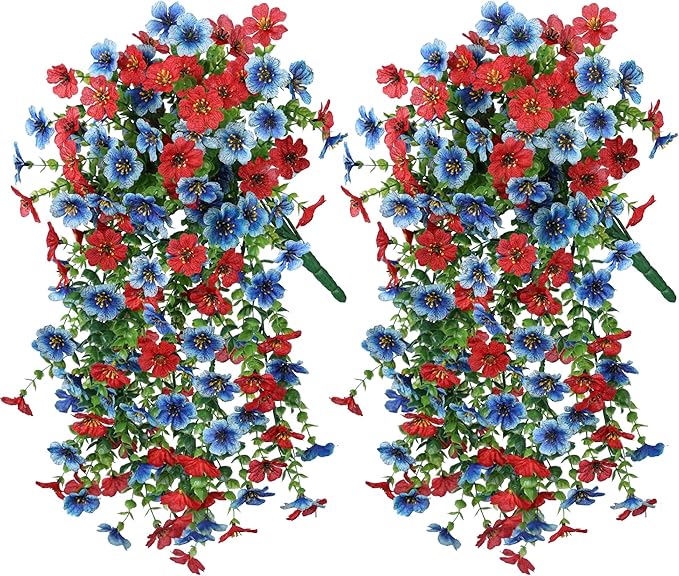 INSPRING Artificial Faux Hanging Flowers Plants for Spring Outdoor Outside Decoration, 2 PCS Fake Silk Daisy with Eucalyptus UV Resistant Realistic Trailing Vines for Balcony Patio Porch (BlueRed)
