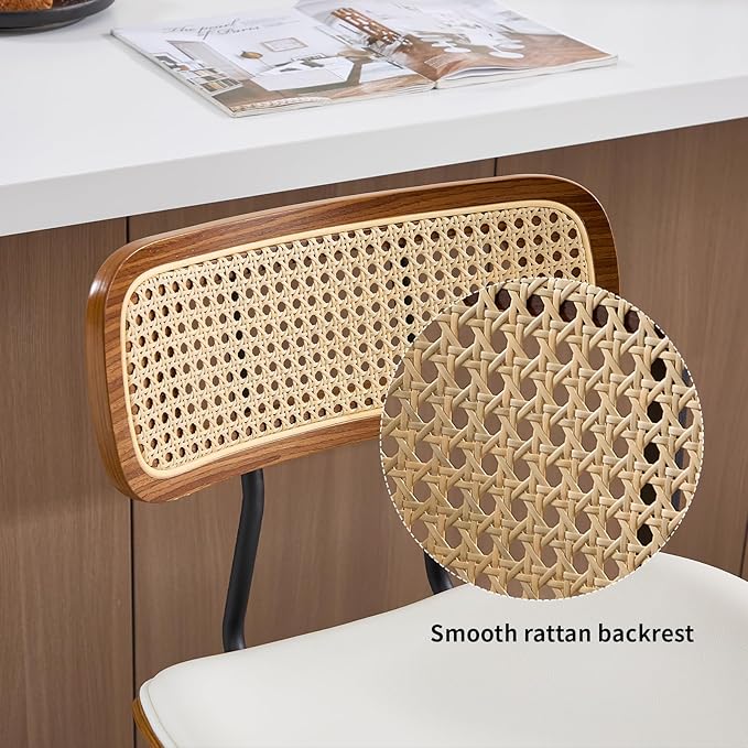 - MODERN RATTAN BAR STOOL – Featuring a stylish woven rattan-style backrest made from premium PE plastic, this high bar stool offers the natural look of real rattan with a smoother, burr-free finish. The elegant walnut wood texture and natural grain add a warm, organic touch to your space—perfect for creating a cozy, modern vibe at your kitchen island or counter.