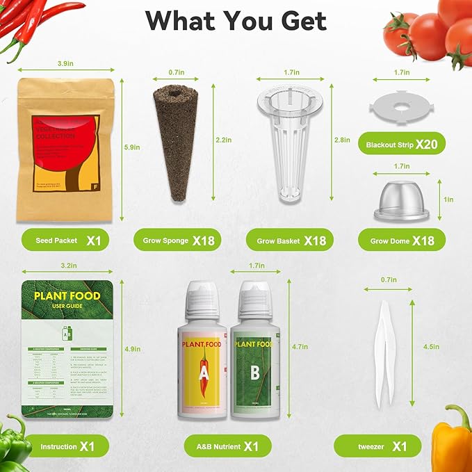 - Variety of Seeds: This pepper seed pod kit includes seven types of heirloom seeds—cucumber, red chili pepper, greenpepper, yellow pepper, purple pepper, red&golden tomato—along with 18 grow sponges, 18 grow domes, 18 grow baskets, 20 foil stickers, and A&B plant food. Perfectly designed for the Inbloom HydroGarden. With over 350 seeds, you can grow your favorites and enjoy endless indoor gardening fun!