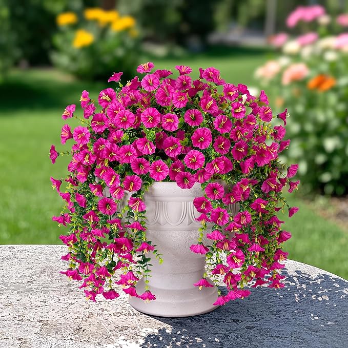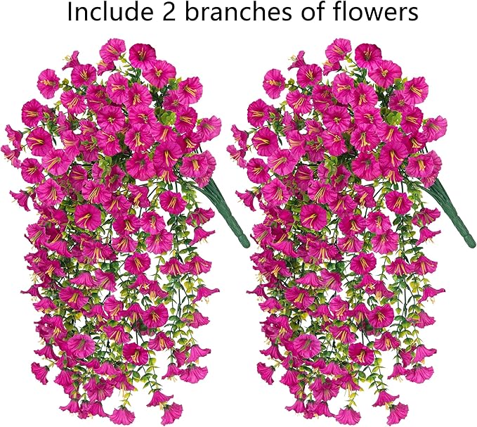 - UV Resistant and Never Fade:These artificial hanging flowers are UV resistant and never fade, can be put outside, living room, office, kitchen, garden, balcony, wall, porch, window, balcony, yard, urn, planter, payhway, front door, flowerbed sill or indoor veranda. Perfect for home, weddings, hotels, terrace, guesthouses, parties or other indoor outside place decoration, create an illusion of enlarged space.