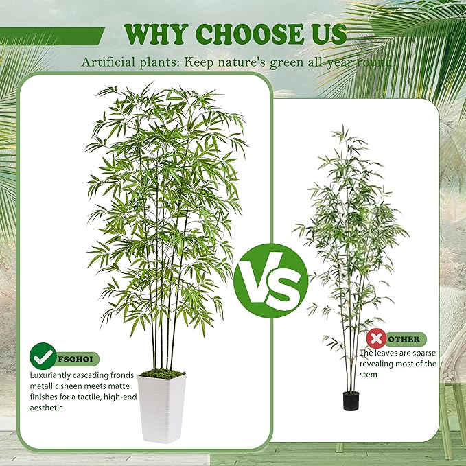 - Fake Bamboo Tree in Pot: FSOHOI 6 feet artificial bamboo plants with a white tall planter, show elegance wherever you put it in your house. Package include: a faux tree, a tall planter and artificial moss