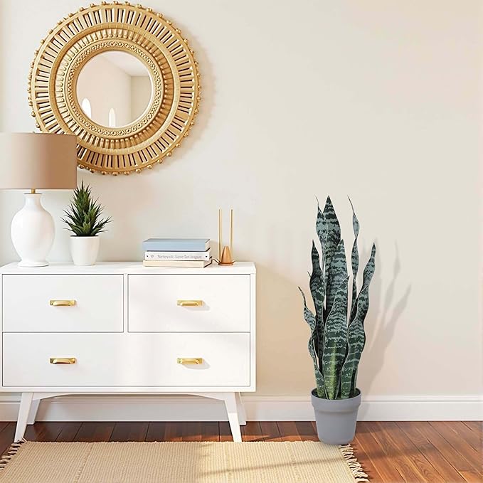 - [Specifications]: This artificial snake plant is 25Inch tall, potted inside a round plastic black pot. Based on soft colors, it is natural and fresh, and the appearance is very close to the real snake plant. It is almost impossible to distinguish the authenticity from a distance. The details are also realistic when viewed up close. It is natural and environmentally friendly, creating a sunny atmosphere.