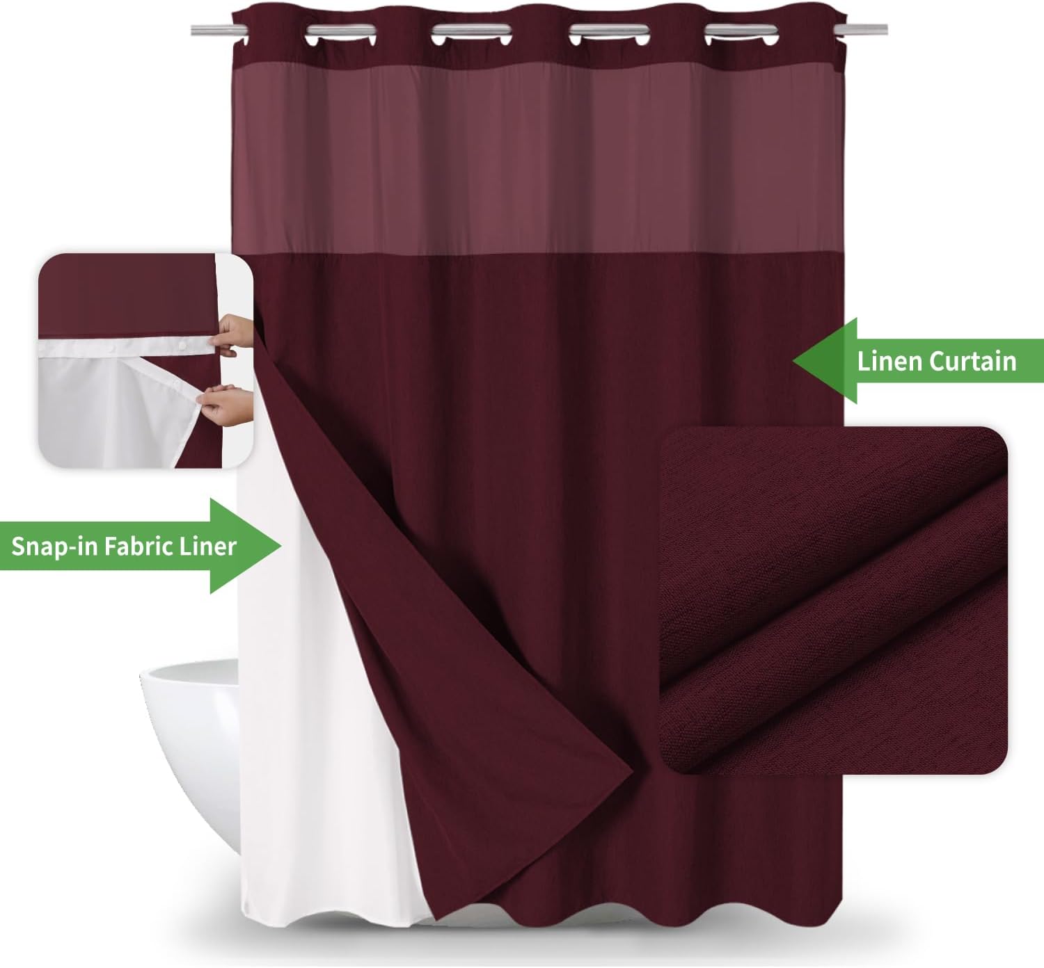 No Hooks Needed Linen Textured Shower Curtain with Snap-in Fabric Liner Set,Hotel Luxury Decor Shower Curtains for Bathroom with Mesh Top Window,Waterproof & Washable,71Wx74H,Burgundy