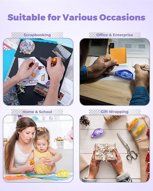 - Large Capacity & Portable: This tape glue runner tool offers an increased capacity of 26 feet and is available in scrapbook kits of 6 or 12—perfect for scrapbooking. It’s lightweight, easy to store, and great for use at home, in classrooms, or in the office. Suitable for both adults and kids
