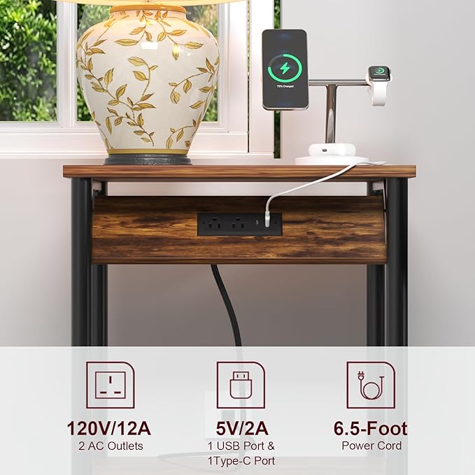 - 【Sofa/Bed Side Tables with Charging Station】 Worried about low battery? The small end tables set of 2 with charger station comes with 2 AC power outlets, 1 USB port and 1 Type-C port, allowing you to use fully charged devices without leaving your bed or sofa