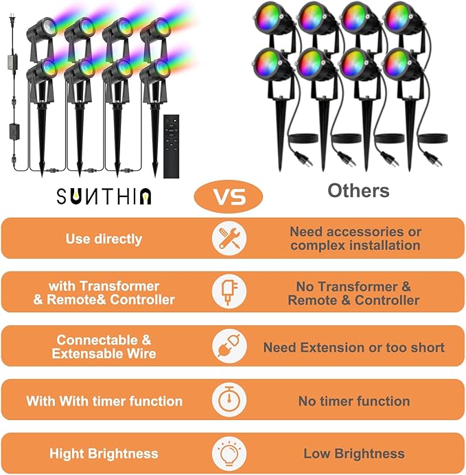 - 【Timer Functions】Utilize the timer feature to automatically turn the lights off at predetermined times, light up your house at night with SUNTHIN outdoor multicolour landscape lights for outdoor decoration for added convenience.