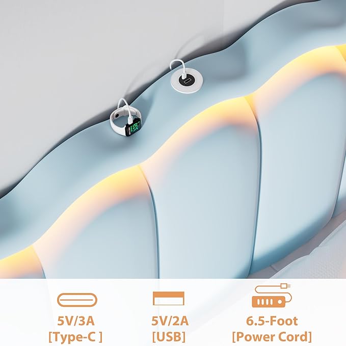 - CHARGING STATION & SIDE POCKETS:This princess bed offers not only comfortable upholstery and an elegant look but also added more convenience. USB and Type-C ports at the headboard keep your devices charged without needing to leave your comfortable bed. Two side pockets provide easy storage for glasses, combs, phones, remotes, and other small essentials, keeping everything within reach