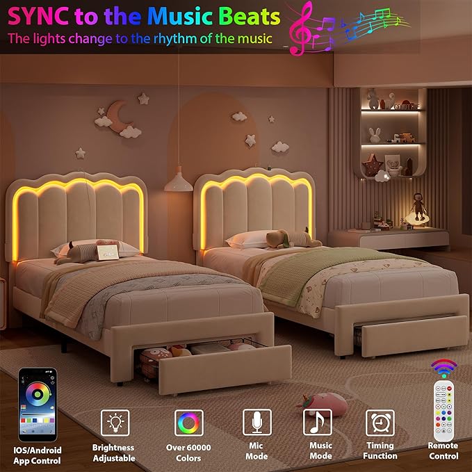 - SMART RGB LIGHTS WITH MUSIC SYNC: This twin bed frame for kids with built-in RGB LED headboard transforms your bedroom with over 16 million colors, 20+ light effects, and dynamic modes controlled by app or remote. Bold lights sync with music, setting the ideal vibe for relaxing, reading, or entertaining. From gentle nightlight for kids to vivid party colors, this velvet bed frame makes every moment magical with immersive ambiance
