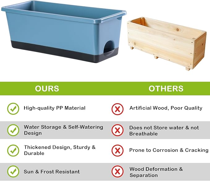 - 【Premium & Durable】The planter pots are made of high quality PP material and has been thickened to bear up to 300KG (660LB). This window box planter is sturdy, wear-resistant and durable. It can be exposed to light, wind, and sunlight for long periods of time, with a lifespan of decades. It is an excellent planter box for both indoor and outdoor.
