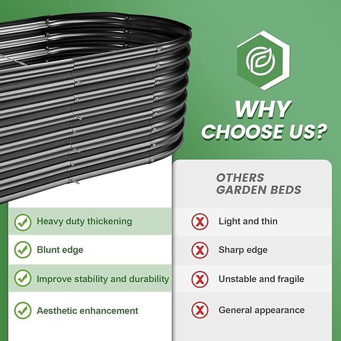 - Upgraded quality and structure: raised garden beds outdoor are made of Q195 galvanized metal sheet, double-layer anti-corrosion galvanizing and oval structure design, which is more beautiful, can withstand greater pressure at the interface, is not easy to loose, and the interface will not Deformed and can be reused for many years.